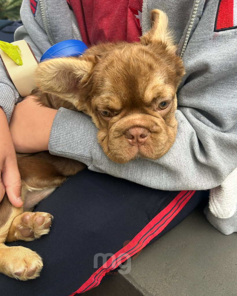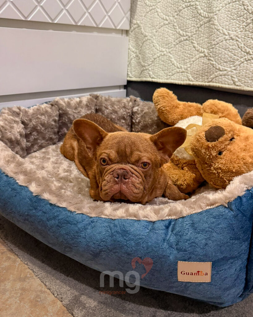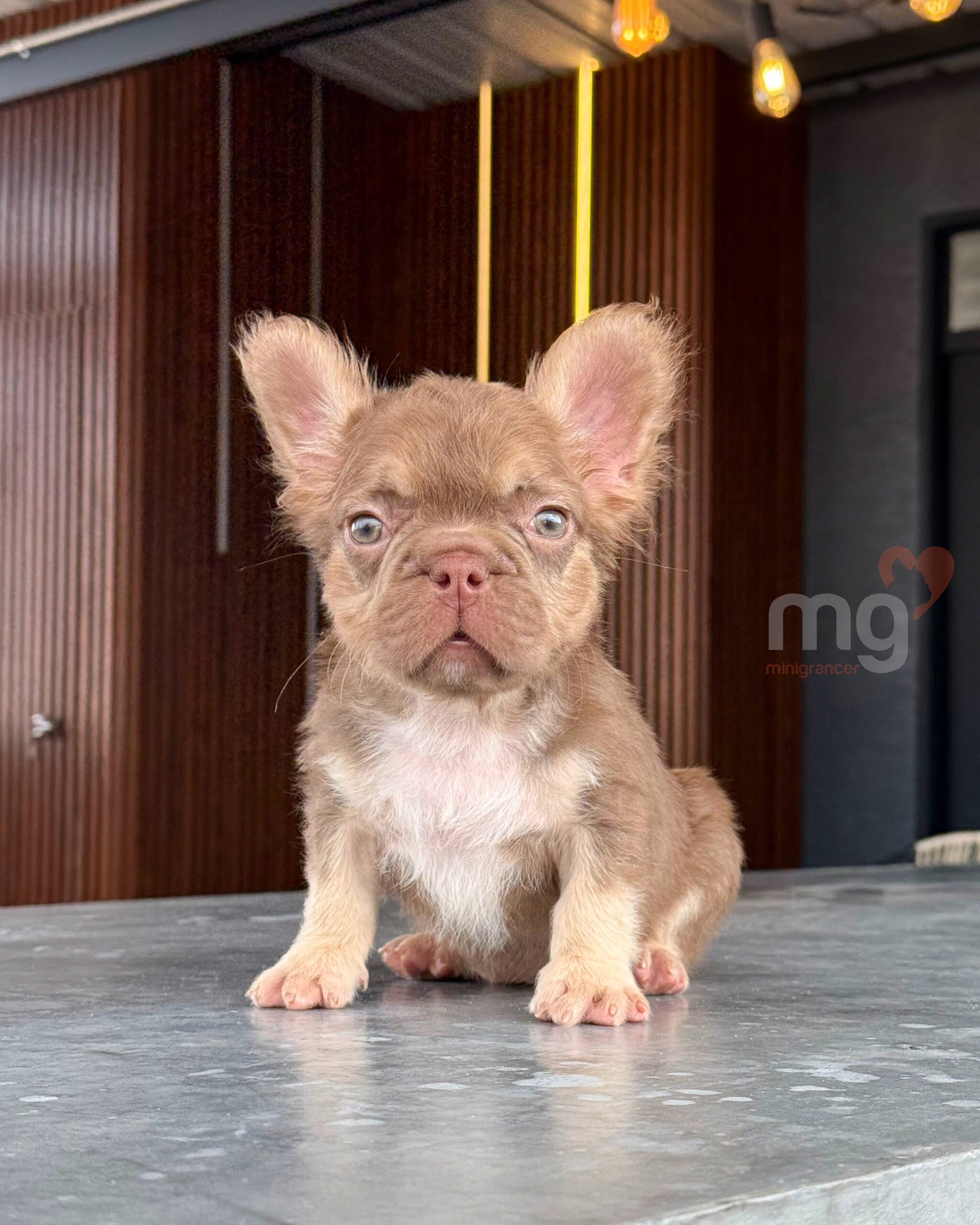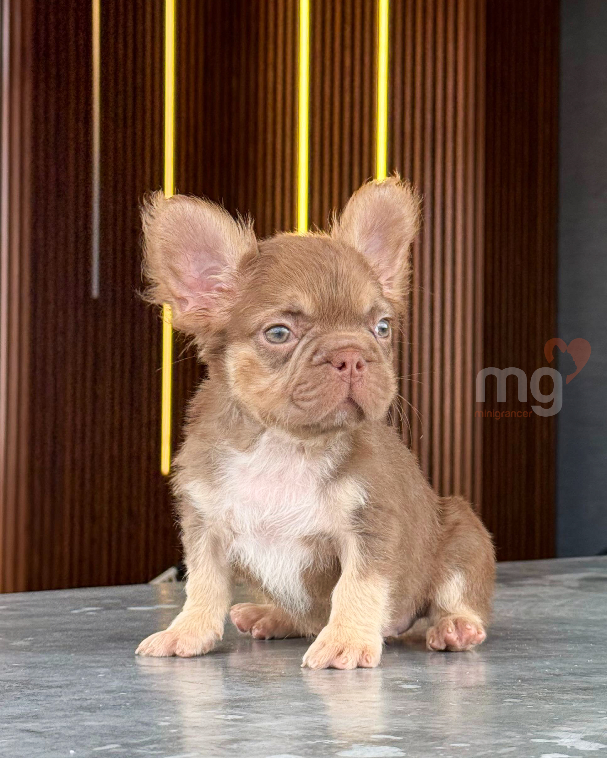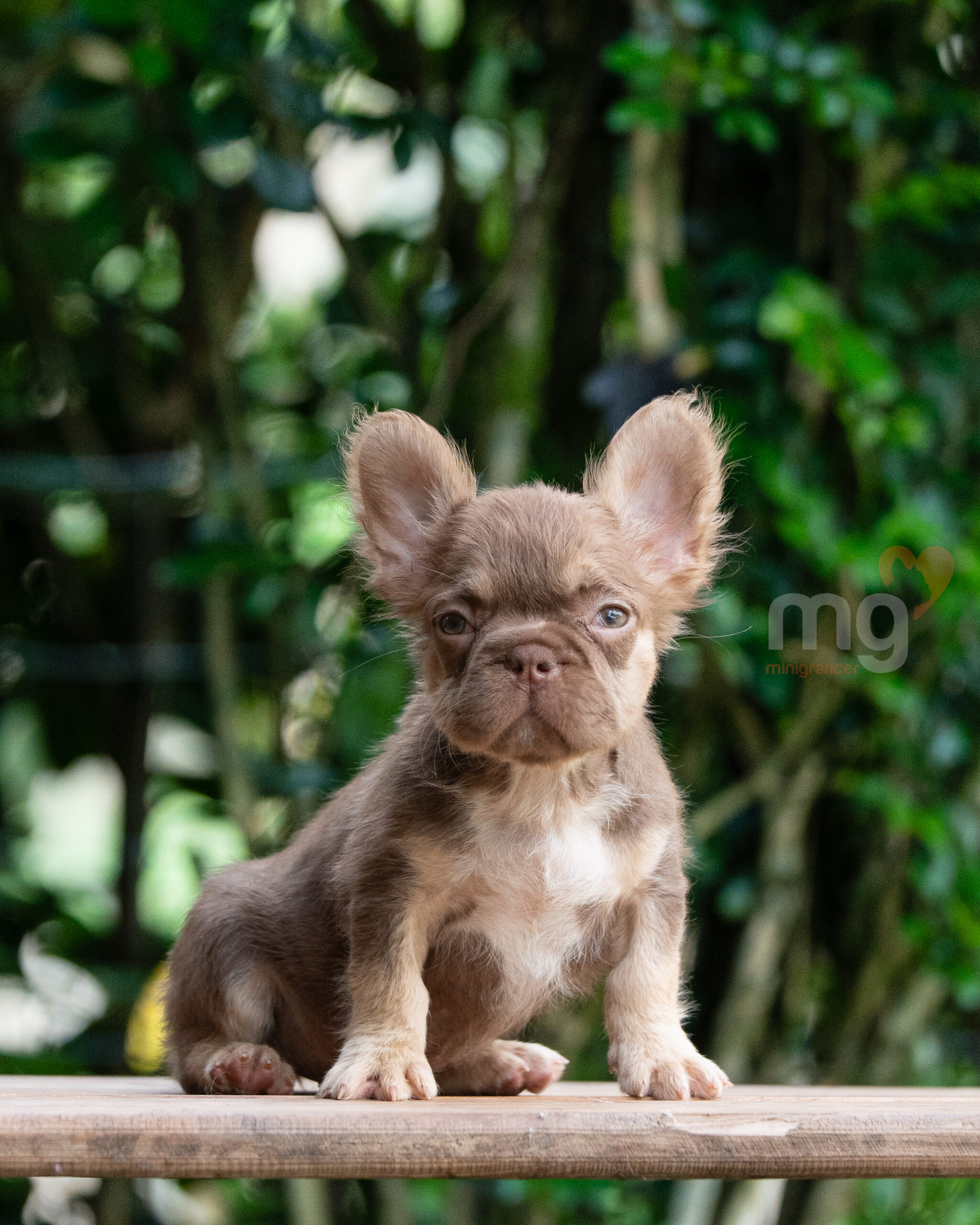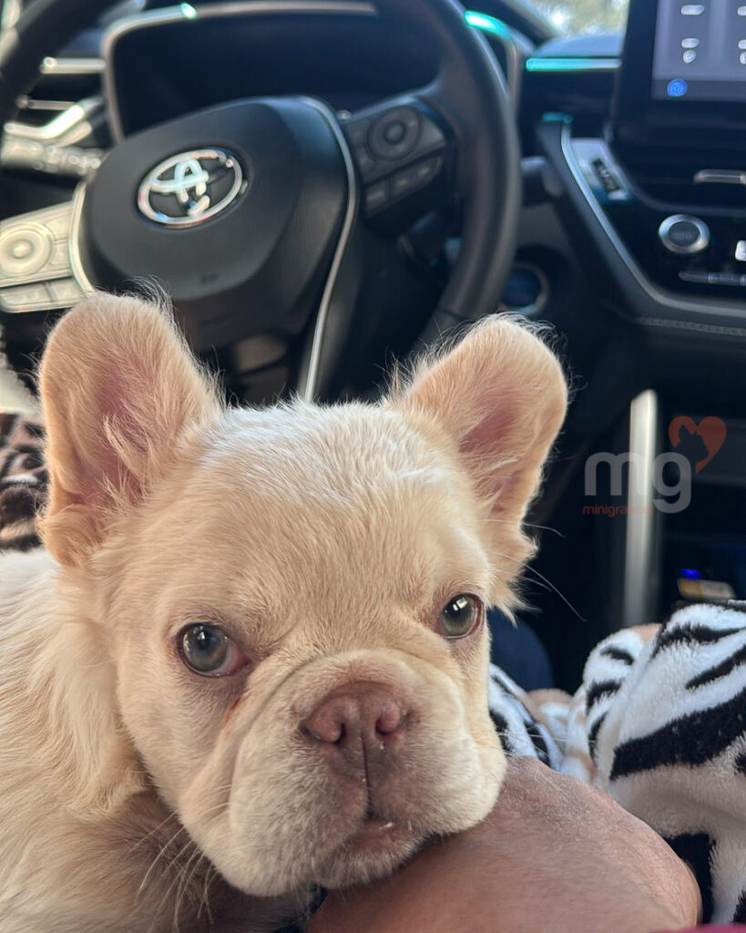 - Color Exclusivo: Pelaje Isabella New Shade Fluffy, una de las combinaciones más exclusivas del mundo del bulldog francés. Su tonalidad mezcla el clásico Isabella con reflejos perlados y matices dorados propios del New Shade, creando un brillo sutil y sofisticado. El manto Fluffy, suave y voluminoso, potencia aún más su elegancia, dándole una textura aterciopelada imposible de ignorar. Un ejemplar de genética premium, presencia imponente y belleza verdaderamente excepcional.
